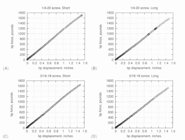 Figure 2. Test results: None of the four test articles broke for tip displacements up to 1.5 inches and tip forces up to 1600 pounds.